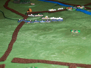 The one glimmer of hope for the Franco-Polish side was the arrival of Sulkowski's Polish 6th and 8th uhlans (seen right centre-rear of this photo). (In the scenario, the arrival of most reinforcements required a 5 or 6 to be rolled. Mitch and I had rolled 2s and 3s for the Polish cavalry on all attempts the previous day. Finally, I had rolled a 5). |
