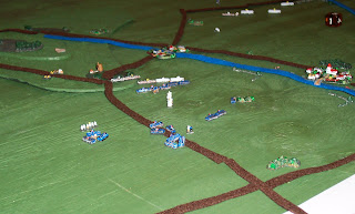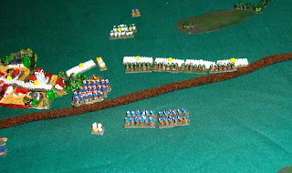 | The Berg lancers were not as successful. After suffering some casualties from Greth's artillery, they were repulsed by the steady fire of the infantry. The latter stood and fired, 18thC-style, which is allowed in the rules. |